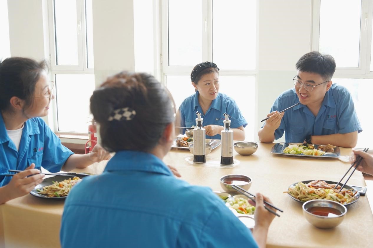 自7月1日起公司調整職工上班時間,改善食堂供餐。公司食堂增加了早餐,午餐由三菜一湯提升為四菜一湯,夜餐標準提高至晚餐的標準。