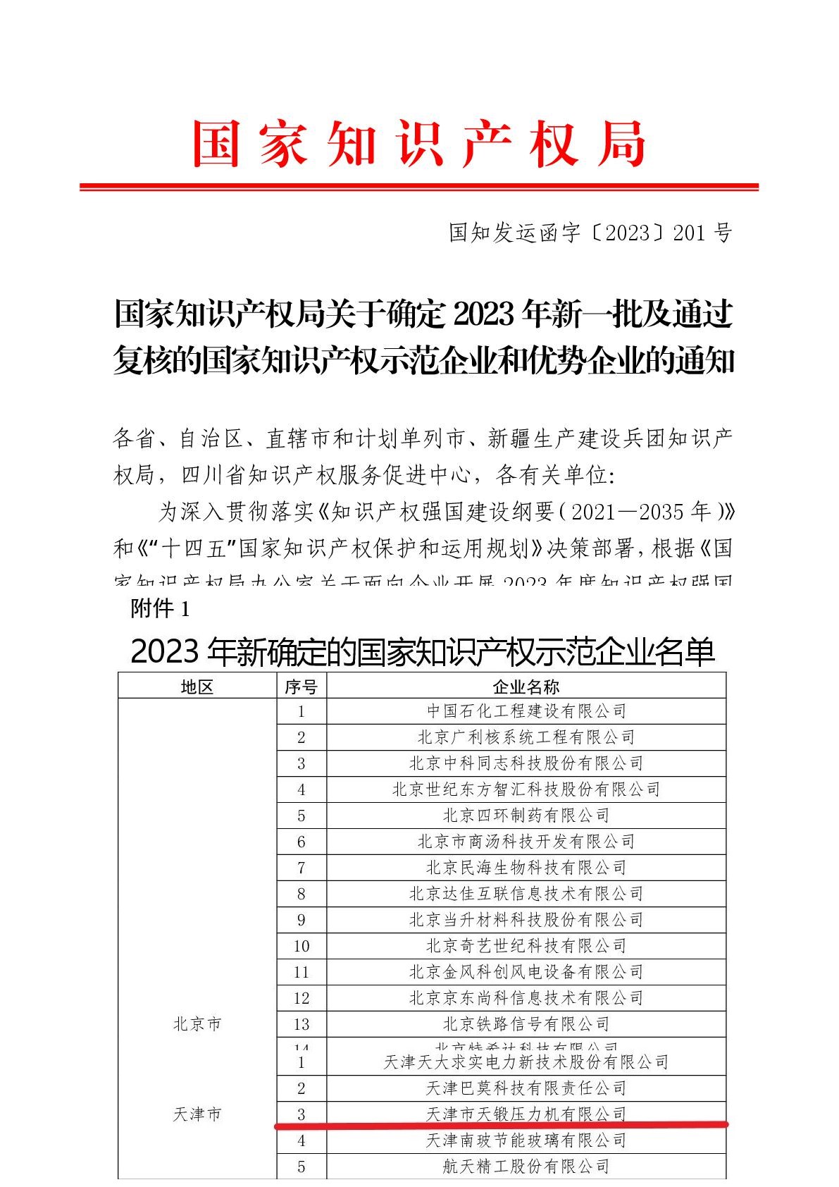 近日,國家知識產(chǎn)權局發(fā)布《國家知識產(chǎn)權局關于確定 2023 年新一批及通過復核的國家知識產(chǎn)權示范企業(yè)和優(yōu)勢企業(yè)的通知》。經(jīng)企業(yè)申報、天津市知識產(chǎn)權局推薦、國家知識產(chǎn)權局批準,天鍛公司成功入選2023年新確定的國家知識產(chǎn)權示范企業(yè)名單。