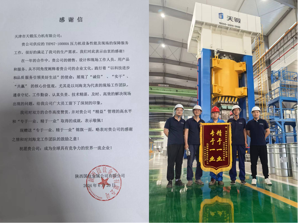 6月,陜西國鈦金屬有限公司、寶雞通潤金屬材料有限公司、江陰恒潤股份有限公司提出設(shè)備保養(yǎng)需求,希望公司派專業(yè)技術(shù)人員到現(xiàn)場指導(dǎo)一次設(shè)備的點(diǎn)檢,確保訂單按期交付。生產(chǎn)制造部專業(yè)技術(shù)人員劉海龍、宋志業(yè)、李曉平、梁旭峰、賀浩、孫博磊積極與客戶溝通,利用各自項目空檔時間分別去往不同的客戶現(xiàn)場,對設(shè)備運(yùn)行精度、設(shè)備壓力、系統(tǒng)穩(wěn)定運(yùn)行等多方面進(jìn)行點(diǎn)檢和培訓(xùn)??蛻魧炯寄苋藛T的專業(yè)水平和敬業(yè)精神高度贊賞,致以感謝信和錦旗。